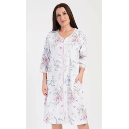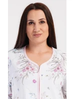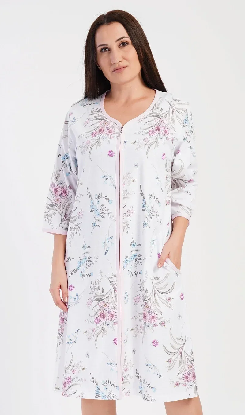 Dámské bavlněné domácí šaty s tříčtvrtečním rukávem Margot. Pohodlné rozepínací šaty v příjemné délce pod kolena využijete téměř při všech volnočasových aktivitách. Mají praktické kapsy a zapínání na zip. Jsou potištěny květy v jemných pastelových tónech, výstřih a rukávy zdobí olemování ve světle lososové barvě. Použitý bavlněný materiál je příjemný a poddajný na dotek.