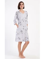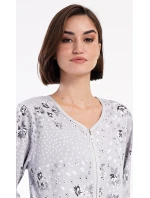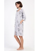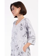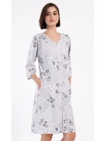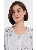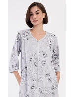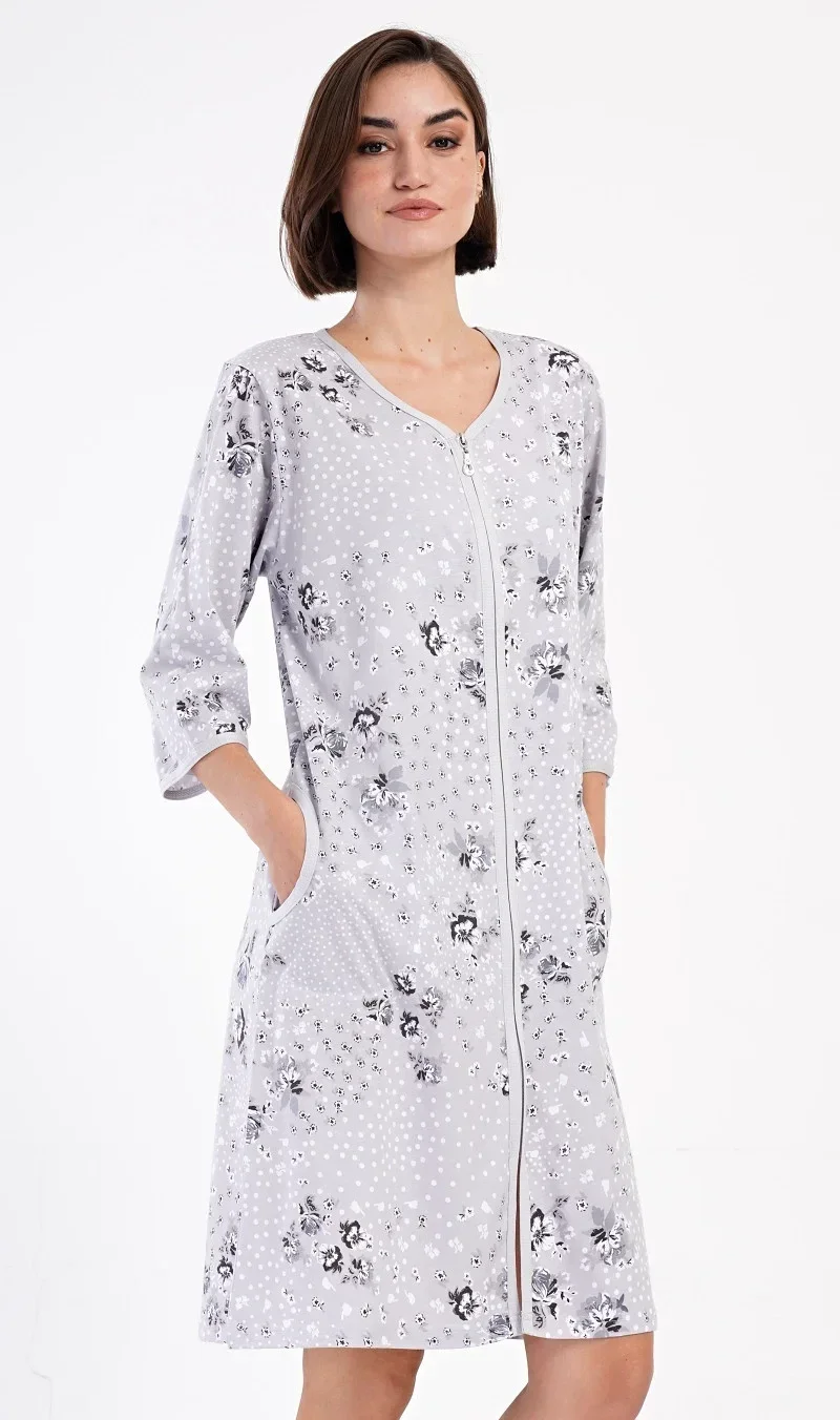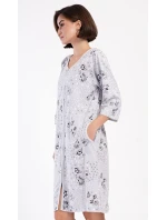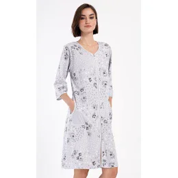 Dámské bavlněné domácí šaty s tříčtvrtečním rukávem Matylda. Pohodlné rozepínací šaty v příjemné délce pod kolena využijete téměř při všech volnočasových aktivitách. Mají praktické kapsy a zapínání na zip. Šedé šaty jsou potištěny decentními květy. Použitý bavlněný materiál je příjemný a poddajný na dotek.