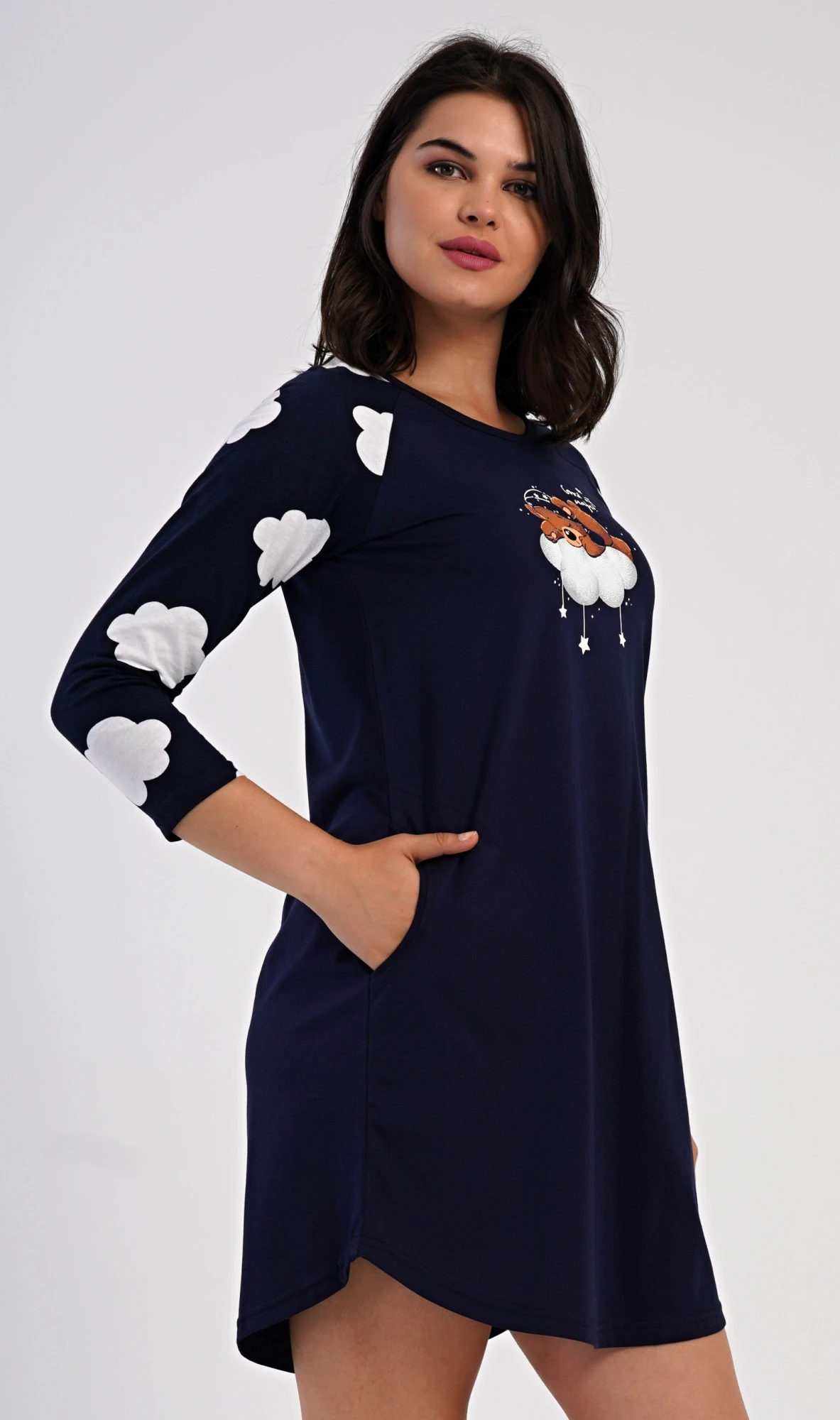 Dámské bavlněné domácí šaty s tříčtvrtečním rukávem Méďa na obláčku. Domácí bavlněné šaty s kulatým výstřihem mají praktické kapsy a zdobí je na hrudi obrázek medvídka, který spí na obláčku. Použitý bavlněný materiál je příjemný a poddajný na dotek.