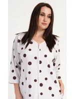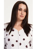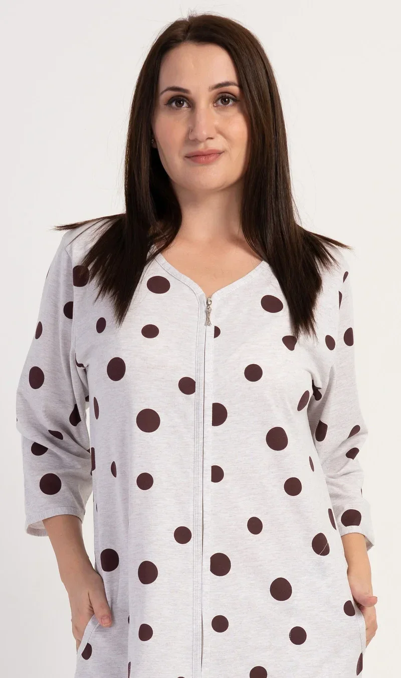 Dámské domácí šaty s tříčtvrtečním rukávem Puntík. Pohodlné rozepínací domácí šaty s decentním potiskem využijete téměř při všech volnočasových aktivitách. Domácí šaty mají praktické kapsy a rozepínání na zip. Použitý materiál s obsahem bavlny 70% je příjemný a poddajný na dotek. Šaty jsou vhodné i na denní nošení.