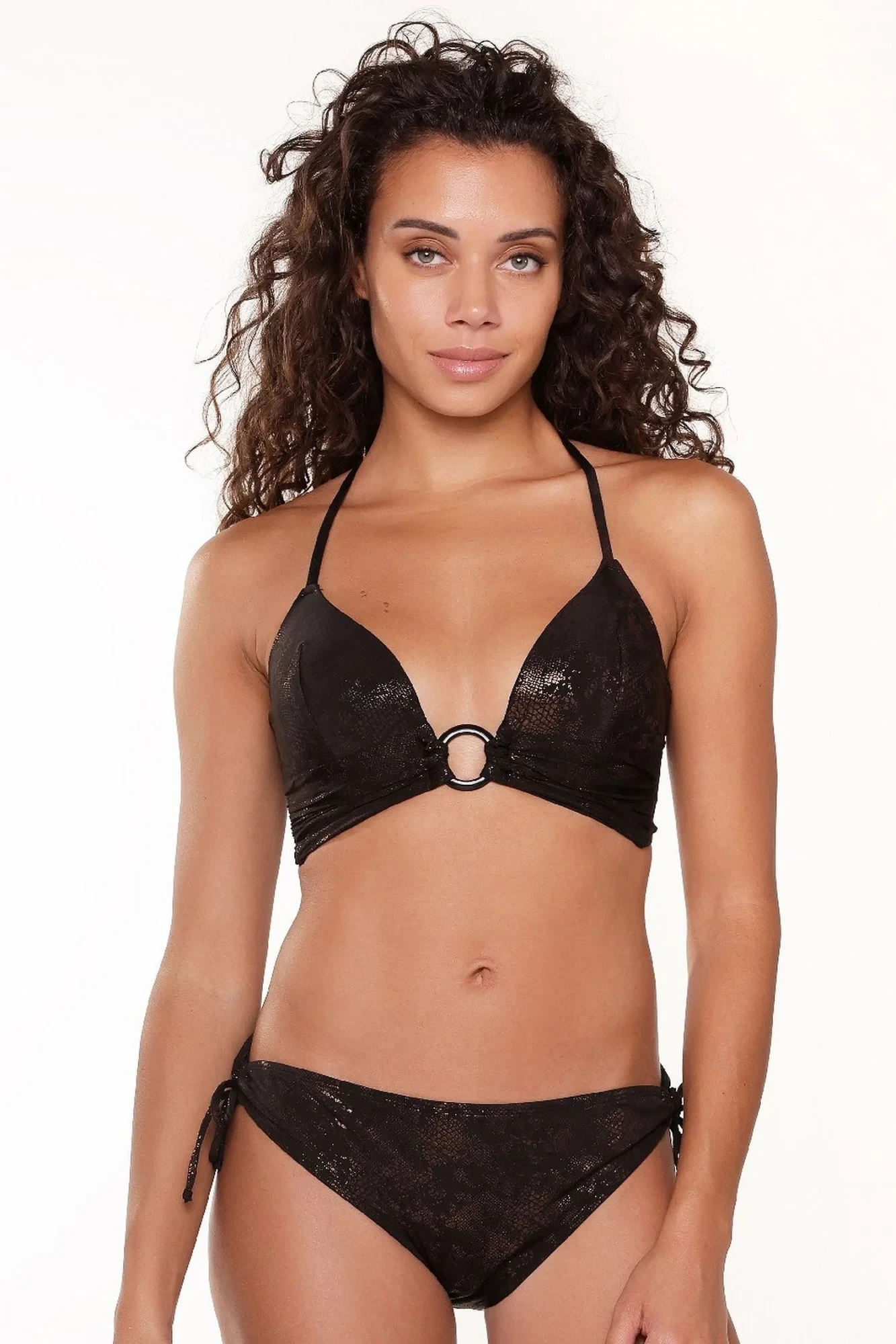 Dámské dvoudílné plavky 7208 LingaDore - černá barva - vyztužené trojúhelníkové košíčky - mezi košíčky je kroužek - s kosticemi - zavazování za krkem - zapínání na plastový háček - kalhotky se šněrováním na bocích