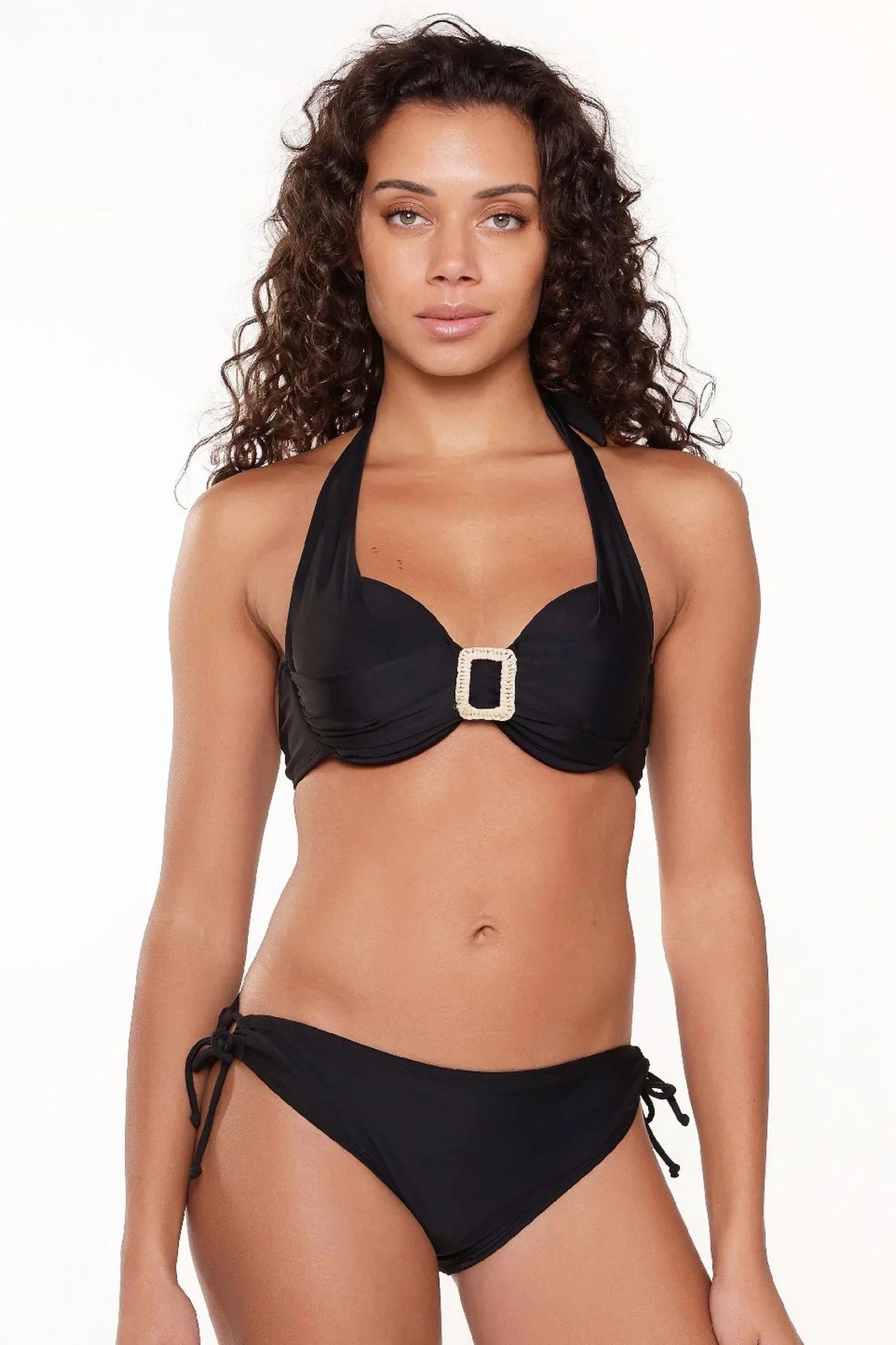 Dámské dvoudílné plavky 7214 black LingaDore - černá barva - košíčky zdobené řasením - mezi košíčky spona - zavazování za krkem nebo na zádech - kalhotky nižšího střihu - zavazování na bocích