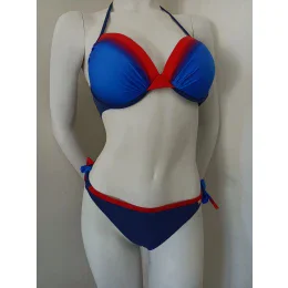 Dámské dvoudílné plavky, vrchní díl vyztužený, s kosticemi, na zavazování za krkem a na zádech. Spodní díl na zavazování na bocích.