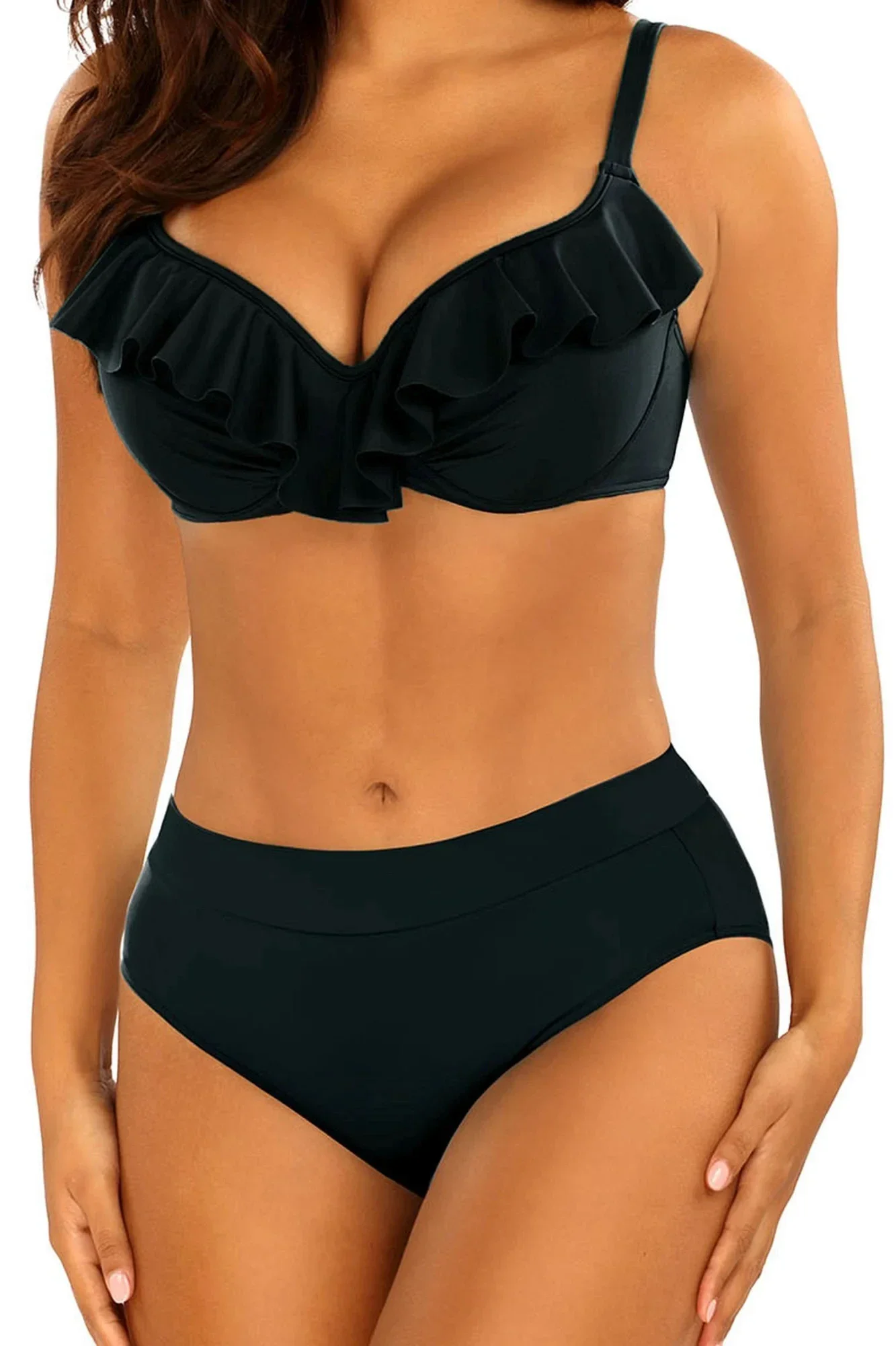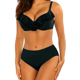 Dámské dvoudílné plavky Canoy 26 996B1 19 SELF - černá barva - plné košíčky zdobené volánky - s kosticemi - nastavitelná a neodepínatelná ramínka - zapínání vzadu na kovovou sponu - kalhotky klasického střihu