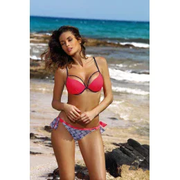 Výjimečné plavky s hladkou podprsenkou, ramínky (gumičkami) ve výstřihu a vzorovanými kalhotkami, se střihem nejmódnějších "brazilky" této sezóny. Hot! Žhavá novinka! Plavky se dodávají ve dvou krásných barvách - pastelově růžové a nektarinkové. Podprsenka je vyztužená jemnou pěnou, ve spodní části má kostice a sexy push-up vycpávky, díky nimž získáte mimořádně smyslný dekolt a samotná prsa budou výrazně blíže k sobě, nadzvednutá a opticky zvětšená. Konstrukce navržená pro malé a střední poprsí vypadá velmi atraktivně. Výstřih s módními pruhy je sladkým lákadlem pro mužské pohledy. Nastavitelné popruhy, pohodlné zapínání na přezku. Vzorované kalhotky s kontrastním lemováním, které dále přechází v koketní vázačky na obou stranách boků. Brazilský střih, který je v této sezóně nejmódnější. Abyste dosáhli plného brazilského efektu, vyhrňte kalhotky výrazně nahoru, aby jejich sexy tvar svůdně zdobil zadeček.
