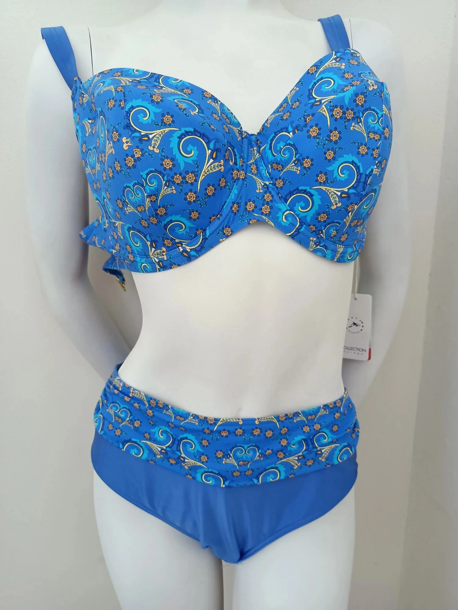 Dámské dvoudílné plavky krásné modré barvy s aplikací . Vrchní díl vyztužený, s kosticemi. Hrubé posouvací ramínka, zapínání podprsenky na zádech.