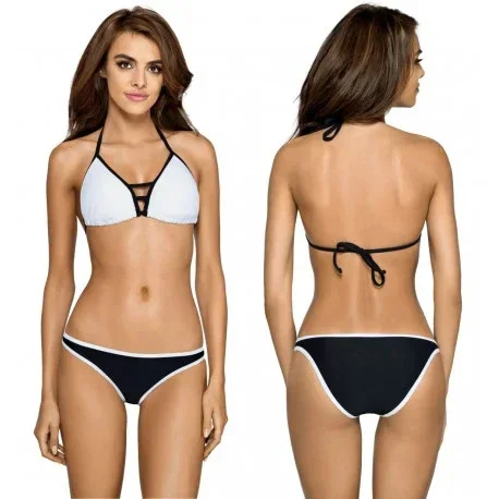 Dámské dvoudílné plavky L1043/8 Lorin s trojúhelníčkovým střihem podprsenky! příjemný plavkový materiál, který rychle schne bílá podprsenka s černým lemováním trojúhelníčkové košíčky (bez kostic) mají vyjímatelné vycpávky ramínka a obvod se zavazují na tenké tkaničky klasické černé kalhotky s bílým lemováním pas a nohavičky jsou elastické kolekce 2018