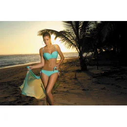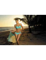 Ženské a koketní dvoudílné plavky s osvědčeným a nenahraditelným vzorem bardot. Balkonová podprsenka dokonale pozvedne a podepře i velká prsa. Prsa jsou dokonale vymodelovaná. Správný střih umožňuje rovnoměrné opálení.