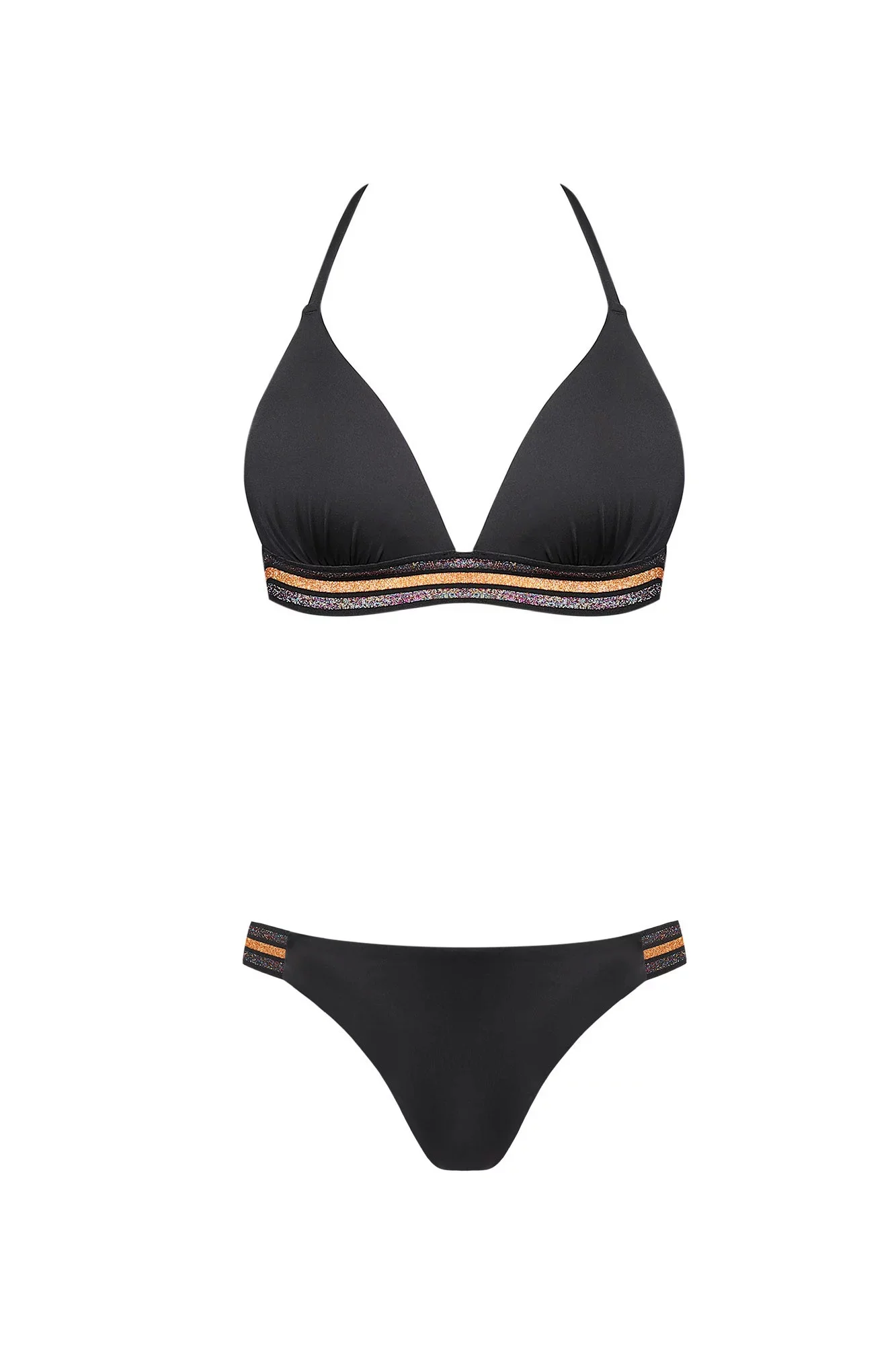 Dámské dvoudílné plavky. Vrchní díl trojuhelníkové košíčky, vyztužené, bez kostic. Na zádech zapínání, za krkem zavazování.