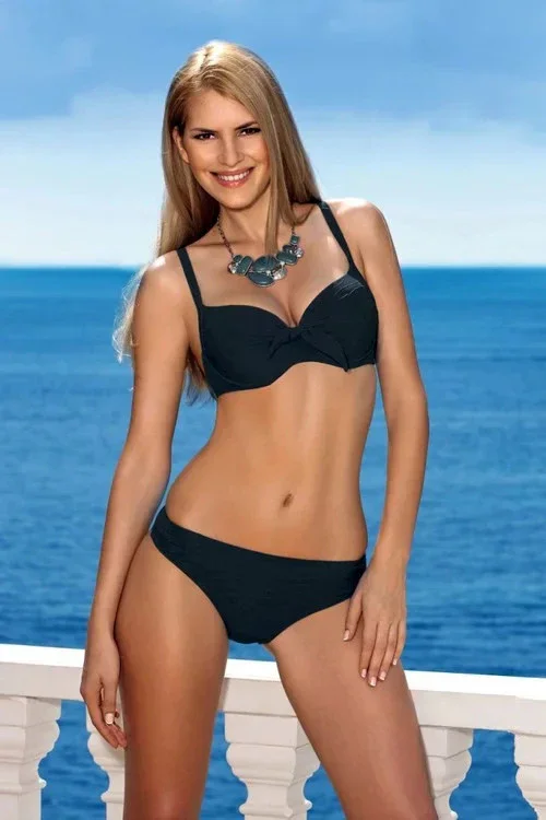 Krásné elegantní plavky Suzana 5241 Lorin jsou navržené pro ženy s větším poprsím. Podprsenka je s kosticemi a vyztuženými košíčky, mezi kterými je uvázaná ozdobná mašlička. Ramínka jsou navržena tak, aby nadnášela tíhu poprsí. Košíčky podprsenky mají krásné a jemné nařasení a jemným potiskem. Podprsenka má zapínání na zádech. Kalhotky jsou velice elegantní a ženské, doplněné v přední částí krásným a jemným potiskem.