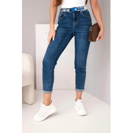 Tmavé dámské džíny mom fit s vysokým pasem a ozdobným páskem jsou must-have v každém šatníku. Tento model spojuje pohodlí klasického střihu s módním akcentem – kontrastním páskem o délce 110 cm, který dodává stylizaci moderní charakter.