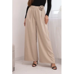 Dámské elegantní kalhoty s širokou nohavicí a ozdobným květem béžové