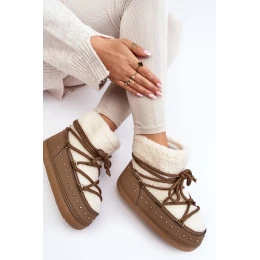 Jedinečné dámské sněhule jsou vyrobeny z chladu a větru odolného materiálu. Svršek s umělou ovčí kůží a cvočky je perfektní na podzimní a zimní období. Klasický nazouvací model s dodatečným šněrováním. Sněžnice byly namontovány na masivní platformě. Uvnitř mají izolaci v podobě pěny a deku na boty, které poskytují vysokou ochranu v chladných dnech. Při výběru velikosti se řiďte tabulkou velikostí.