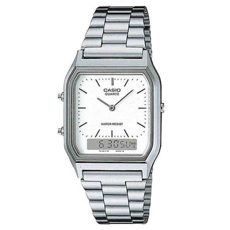 Casio AQ-230 jsou hodinky, které v sobě spojují prestiž, funkčnost a nadčasovou estetiku. Hodinky Casio AQ-230 jsou ideální volbou pro ty, kteří oceňují vintage styl, ale nechtějí se vzdát moderních řešení - nejsou jen o krásném designu, ale také o dokonalé přesnosti. Duální analogově-digitální displej umožňuje kontrolovat čas ve dvou zónách současně, zatímco další funkce, jako je budík, stopky a automatický kalendář, jim dodávají na praktičnosti.