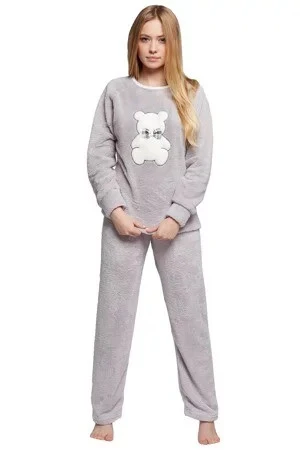 Dámské huňaté pyžamo, dlouhé kalhoty, dlouhé rukávy. Kalhoty v pase na gumu. Vrchní díl s kulatým výstřihem kolem krku. Na prsou našitý obrázek medvídka s mašlí.