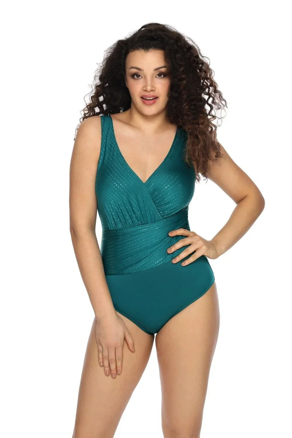 Dámské jednodílné plavky 44 AVA - smaragdová barva - z kvalitního mikrovlákna - přední část zdobená lesklým vzorem - mírně vyztužené košíčky - bez kostic - vykrojené na zádech