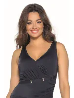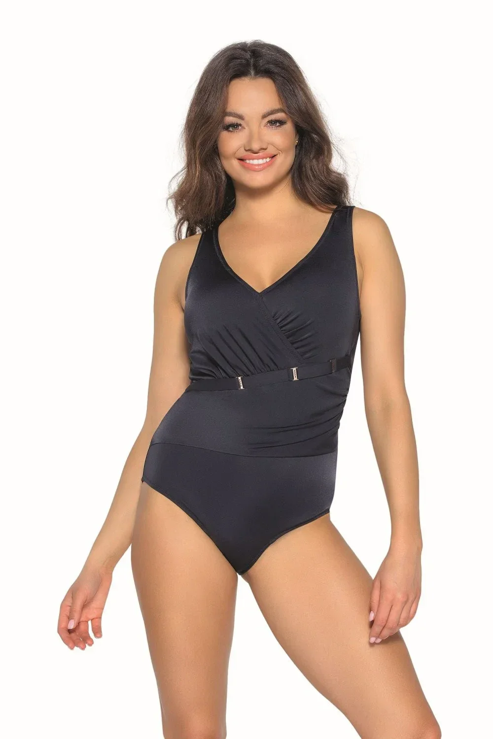 Dámské jednodílné plavky 48 black AVA - černá barva - z hladkého mikrovlákna - asymetrický střih - opticky zeštíhlí postavu - přední díl modelu je z vnitřní strany podšitý vrstvou síťoviny - všité košíčky udrží poprsí na správném místě - ozdobný pásek v pase - zadní část i přes hluboké vykrojení na zádech hladce přilnou k tělu a zabraňují klouzání ramínek