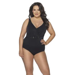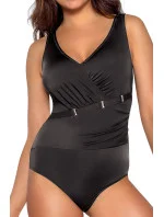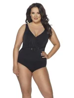 Dámské jednodílné plavky 48 black plus AVA - černá barva - z hladkého mikrovlákna - asymetrický střih - opticky zeštíhlí postavu - přední díl modelu je z vnitřní strany podšitý vrstvou síťoviny - všité košíčky udrží poprsí na správném místě - ozdobný pásek v pase - zadní část i přes hluboké vykrojení na zádech hladce přilnou k tělu a zabraňují klouzání ramínek