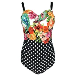 Dámské jednodílné plavky s potiskem květů a puntíků. Košíčky vyztužené s podpůrnou gumou , bez kostic. Posouvací ramínka, vepředu odepínací.