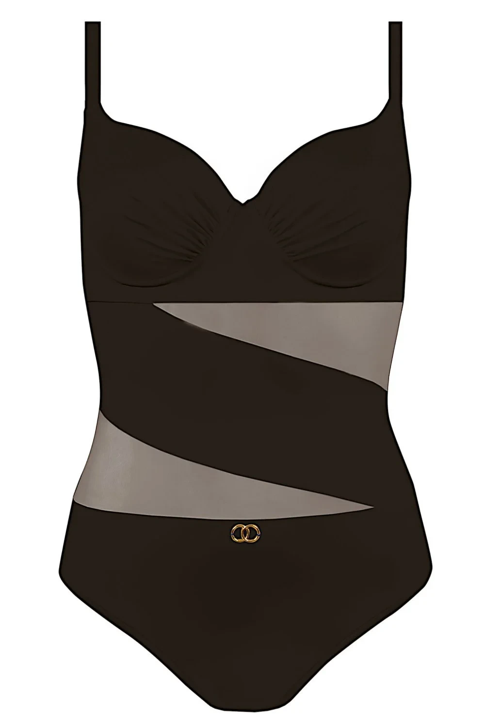 Dámské jednodílné plavky 964V19 Fashion5 Self - plavky jsou vyrobené z příjemného, pružného a rychleschnoucího materiálu - módní střih - termicky formované - nastavitelná ramínka - zapínání zezadu - košíčky jsou vyztužené kosticemi - přední část zdobená průsvitnou látkou - kolekce 2023