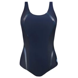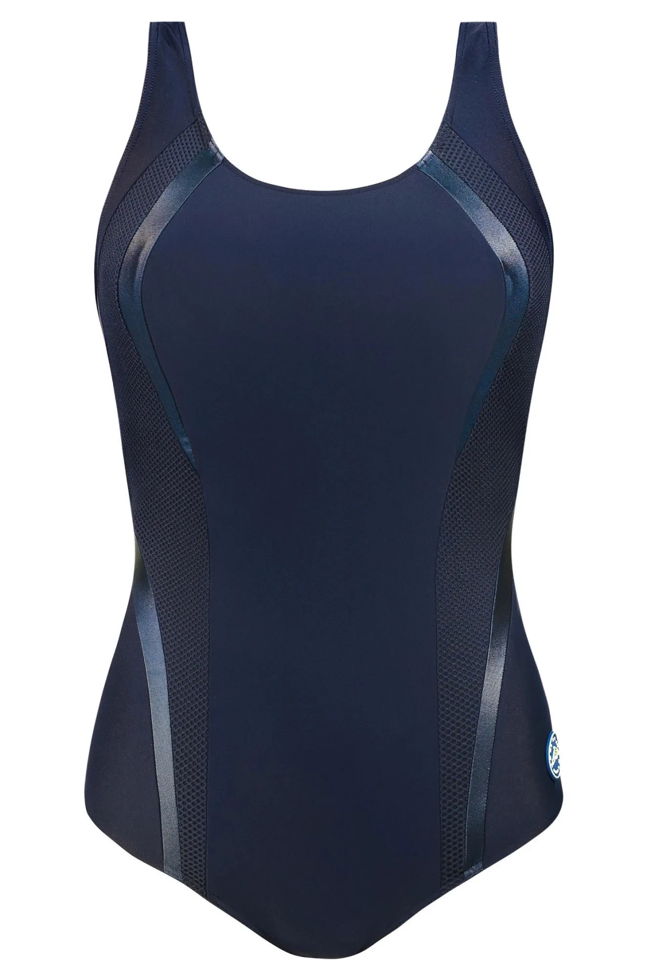 Dámské jednodílné plavky Atlantic sport 34A1 47 SELF - tmavě modrá barva - z vysoce jakostního materiálu - jemně vyztužené košíčky - barevné vsadky na bocích - širší ramínka s regulací - rychleschnoucí materiál, odolný proti chlóru a slunci