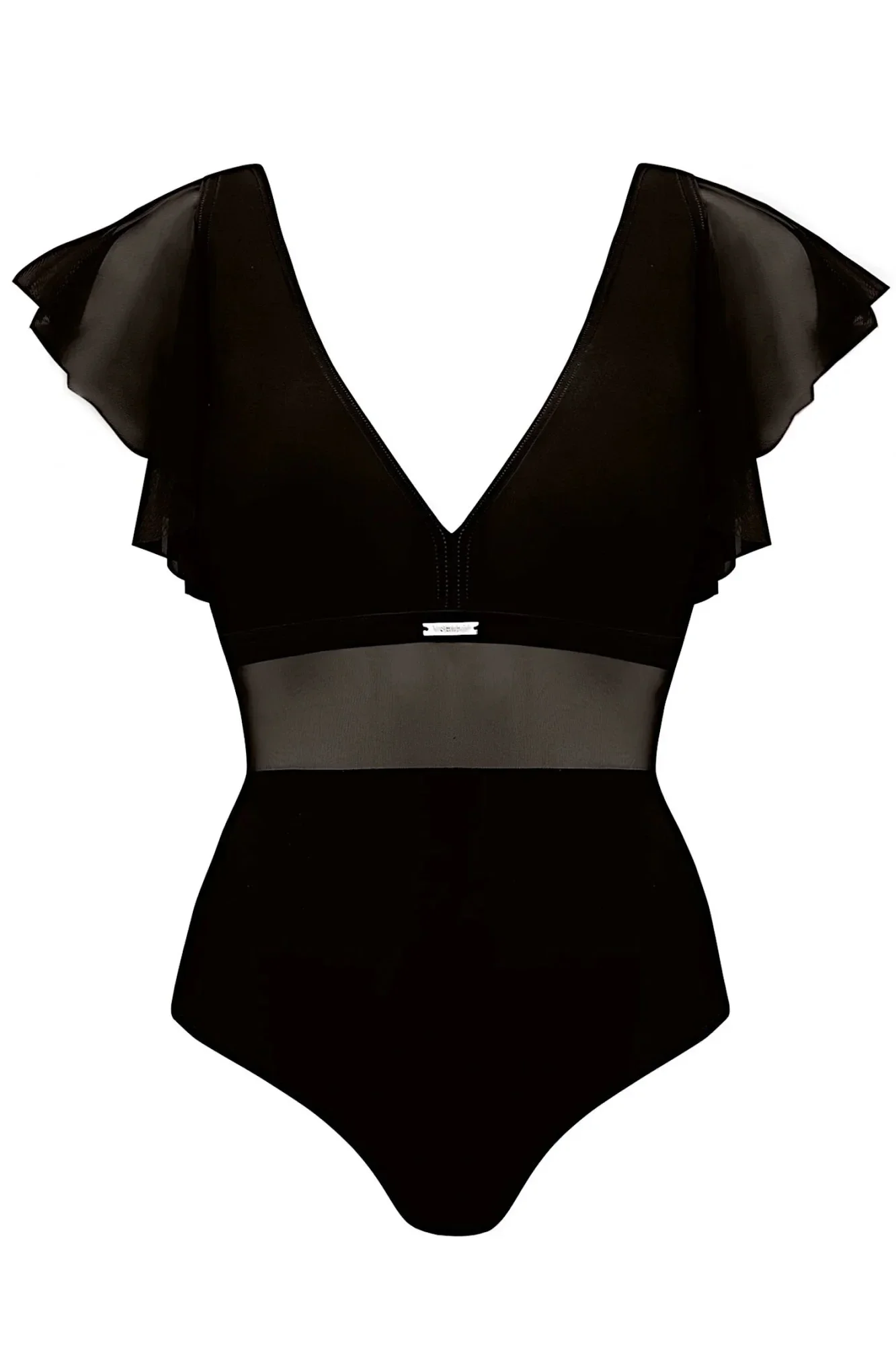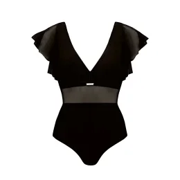 Dámské jednodílné plavky Canoy 16 1086S 19 SELF - černá barva - z vysoce jakostního mikrovlákna - košíčky bez vycpávek - pozlacená ozdoba mezi košíčky - volánkové rukávy - jemná síťovina pod prsy - hluboký výřez na zádech - elastický pas opticky zeštíhluje postavu - rychleschnoucí materiál, odolný proti chlóru a slunci
