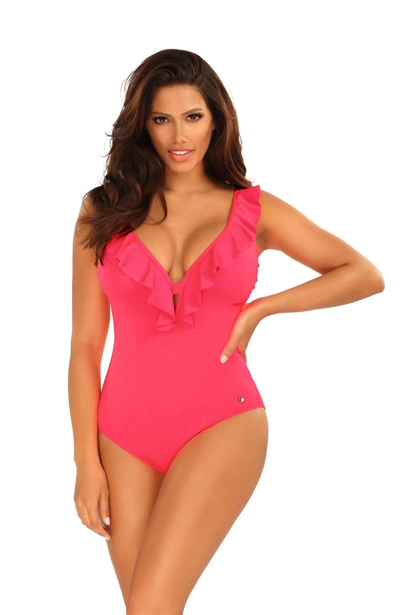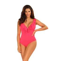 Dámské jednodílné plavky Canoy 19 1077 2 SELF - růžová barva - z jemného a hladkého mikrovlákna - podprsenková část je jemně vyztužená - hluboký výstřih - ozdobný volán navazuje na ramínka - nastavitelná a neodepínatelná ramínka - zavazování na zádech - rychleschnoucí materiál, odolný proti chlóru a slunci