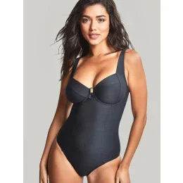 Romantické plavky z kolekce Marianna značky Panache jsou ideální pro váš malý útěk. Elegantní a zároveň stylový kousek ve snové černé barvě. Košíčky s kosticemi dokonale vytvoří zvýrazněnou postavu a zároveň poskytnou požadovanou oporu. Mezi poprsím je navíc přidán malý zlatý obtisk, který okouzlujícímu kousku dodává punc luxusu. Do živůtku jsou vetknuty zeštíhlující panely, které nabízejí ještě lichotivější styl. Mírné zakrytí zadního dílu pokračuje v elegantním tématu. Vnitřní panely ze síťoviny Power Mesh nabízejí mírnou kontrolu bříška, která přidává další vyhlazující prvek.