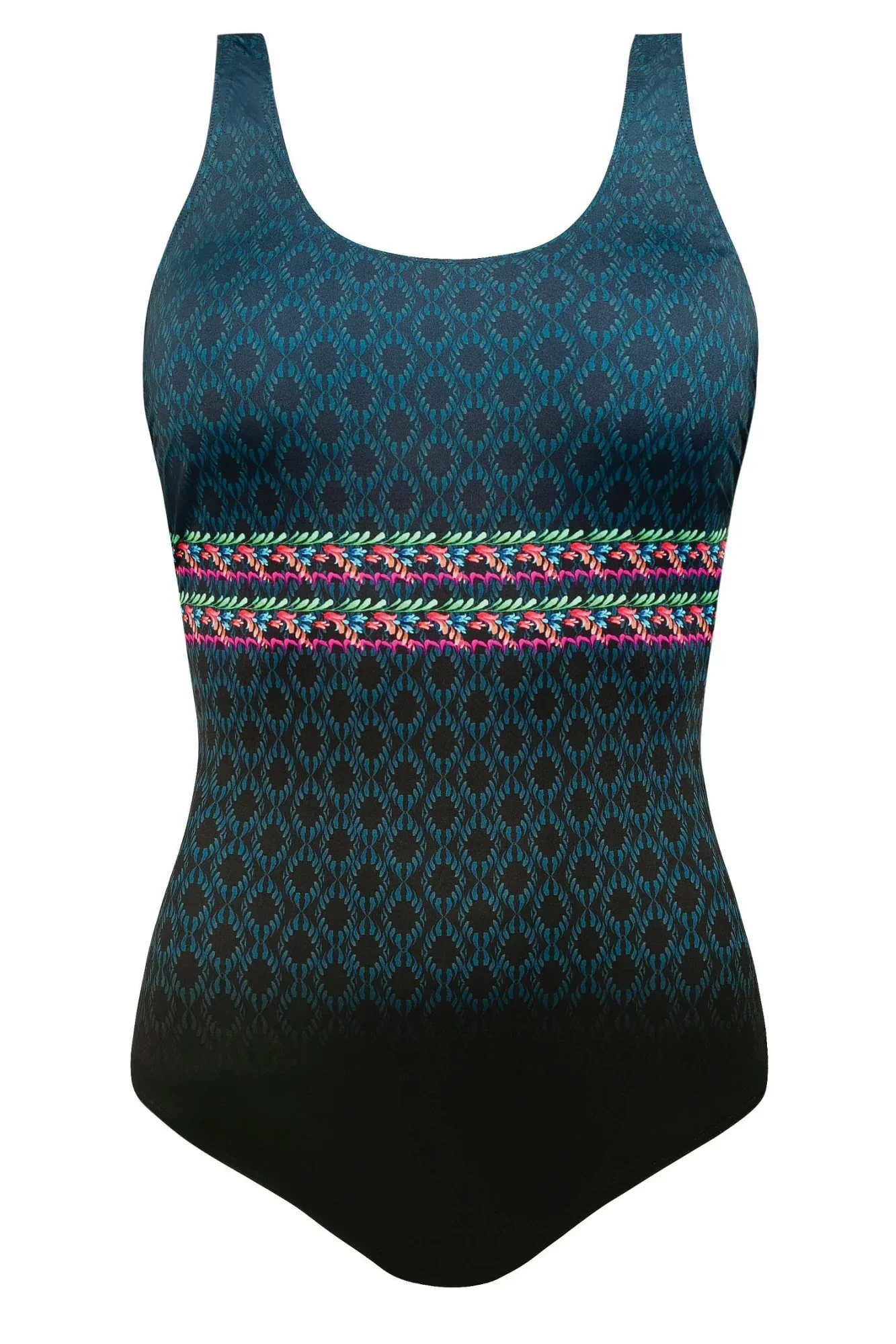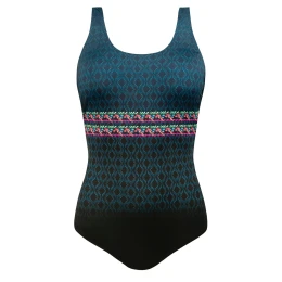 Dámské jednodílné plavky Trends sport 36PW 24 SELF - tmavě modrá barva - ozdobené na přední straně barevným vzorem - zadní část černé barvy - boky z transparentní síťoviny - vyztužené košíčky - bez kostic - nastavitelná širší ramínka - odolné proti chloru