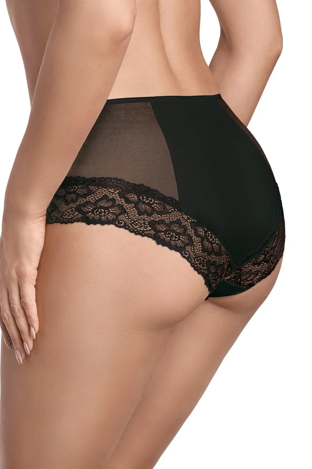 Klasické vysoké kalhotky 029 Ewana - černá barva - klasický střih - na bocích plnější - vyrobené z hladkého mikrovlákna, jemné tylové síťoviny a z efektní krajky s květinovým motivem
