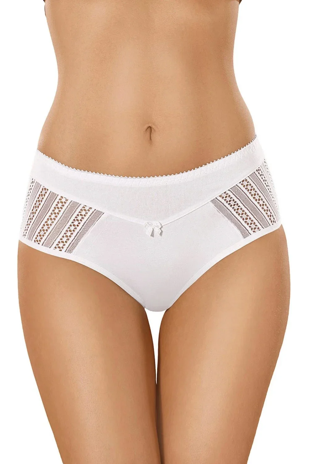 Dámské kalhotky 062 white Gabidar - bílá barva - kalhotky mají klasický střih a lehce zvýšený pas - na bocích mají jemnou krajku se vzorem - elegantní design - na přední straně roztomilá mašlička