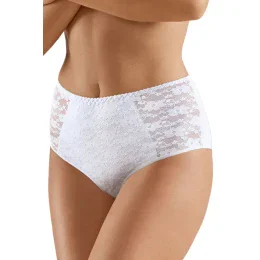 Dámské kalhotky 070 Babell - bílá barva - vyšší a plnější střih - přední část zdobená krajkou - obepínající látka tvaruje břicho - boky jsou ažurové - zadní část z bavlny