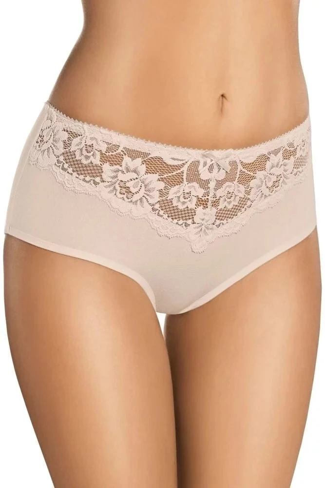 Elegantní, dámské kalhotky. Mají lehce zvýšený pas. Vpředu je saténová mašlička. U horního okraje krajkové všivky. Model dokonale přiléhá na tělo a je pohodlný. Ušité z kvalitní bavlny.