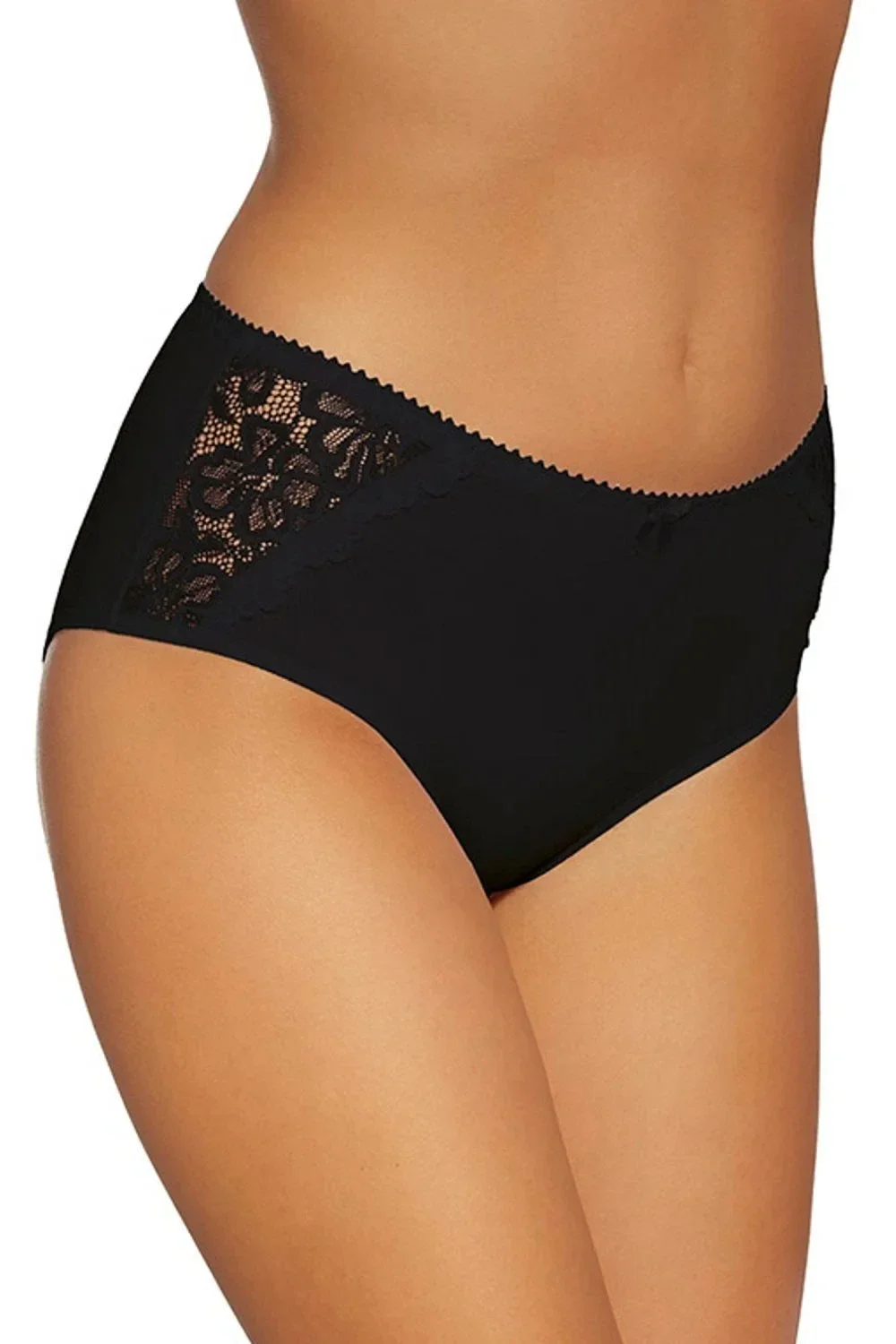 Dámské kalhotky 139 black GABIDAR - černá barva - kalhotky mají klasický střih a zvýšený pas - na bocích mají jemnou krajku s květinovým vzorem - jednoduchý design - na horním lemu roztomilá mašlička