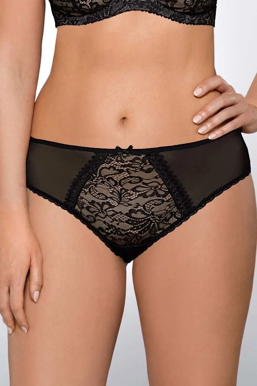 Dámské kalhotky 1396 Crystal black AVA - černá barva - mají vpředu vsadky z krajky a síťoviny - zadní díl je vyrobený z hladké látky - nohavičky jsou zakončené pružnou pogumovanou krajkou - kalhotky jsou ozdobené půvabnou saténovou mašličkou