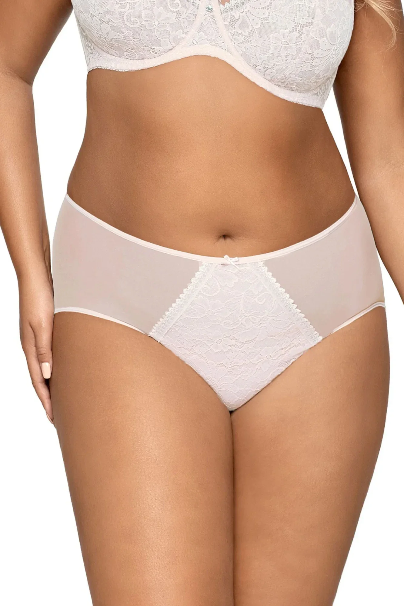Dámské kalhotky 1396 Crystal white AVA - bílá barva - mají vpředu vsadky z krajky a síťoviny - zadní díl je vyrobený z hladké látky - jsou zakončené pružnou pogumovanou krajkou - jsou ozdobené půvabnou saténovou mašličkou
