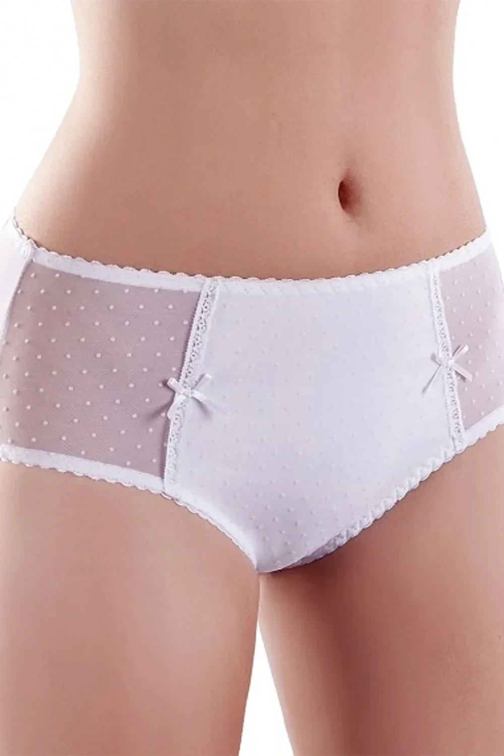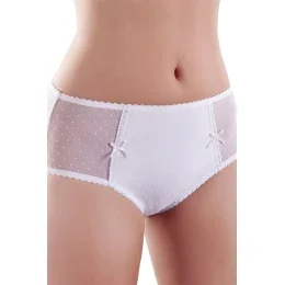 Dámské kalhotky155 Modo klasického střihu - z kvalitního vzorovaného mikrovlákna ve spojení s elastickou síťovanou látkou s puntíky - přední část dekorují vsadky z jemné krajkové stuhy