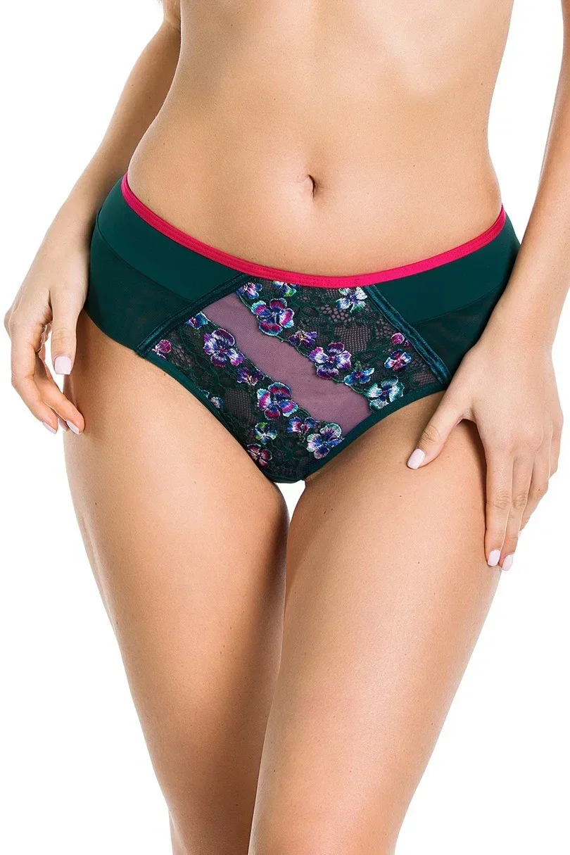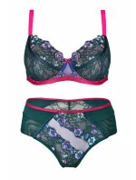Zadní díl kalhotek je ušitý ze dvojitého tylu. Přední díl modelu tvoří smaragdový materiál a výšivka. V pase modelu je lemovka v amarantové barvě.
