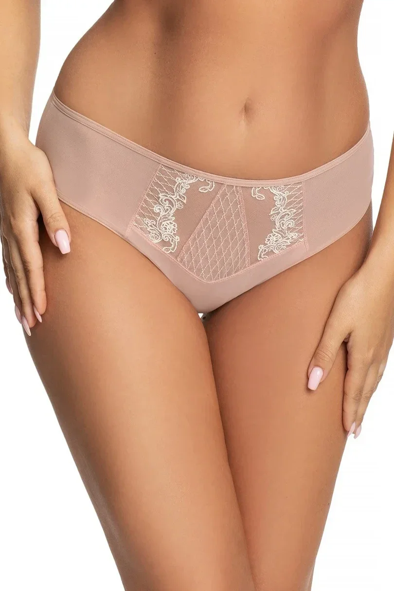 Přední díl kalhotek zdobí vsadka z vyšívané síťoviny. Boky a zadní díl modelu jsou ušité ze dvojité síťoviny.