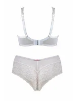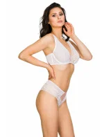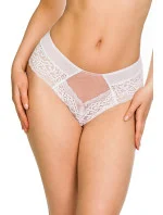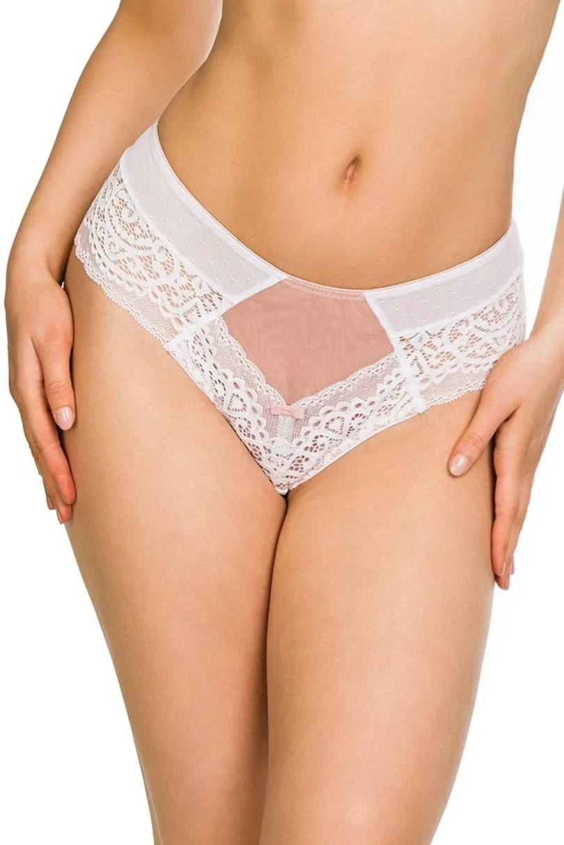 Zadní díl kalhotek je vysoko vykrojený. Vrchní část zadního dílu tvoří drobně puntíkovaný tyl a spodní část je ušitá z krajky. Přední díl modelu je vyrobený z bílé krajky s květinovým motivem a z tylu v pudrově růžové barvě.
