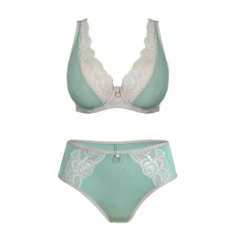 Zadní díl kalhotek je vysoko vykrojený a je vyrobený ze zeleného mikrovlákna. Přední díl modelu je ušitý z béžové krajky s květinovým motivem se zelenou přízí. Boky kalhotek tvoří mikrovlákno. V pase modelu je béžová lemovka s bižuterní ozdobou ve tvaru kolečka.