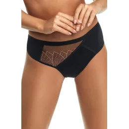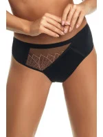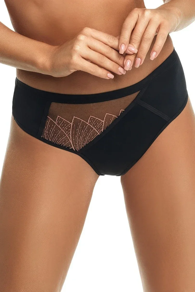 Přední díl kalhotek je ozdobený šikmo všitým vyšívaným prvkem. Vzadu je model hladký. Nohavičky jsou na předním dílu olemované na plocho tenkou pružnou páskou.