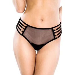 Neobyčejné dámské kalhotky typu brazilky. Pozadí je z dvojtého tylu. Na bocích nastavitelné pásky. Kroužky a regulátory mají zlatou barvu.