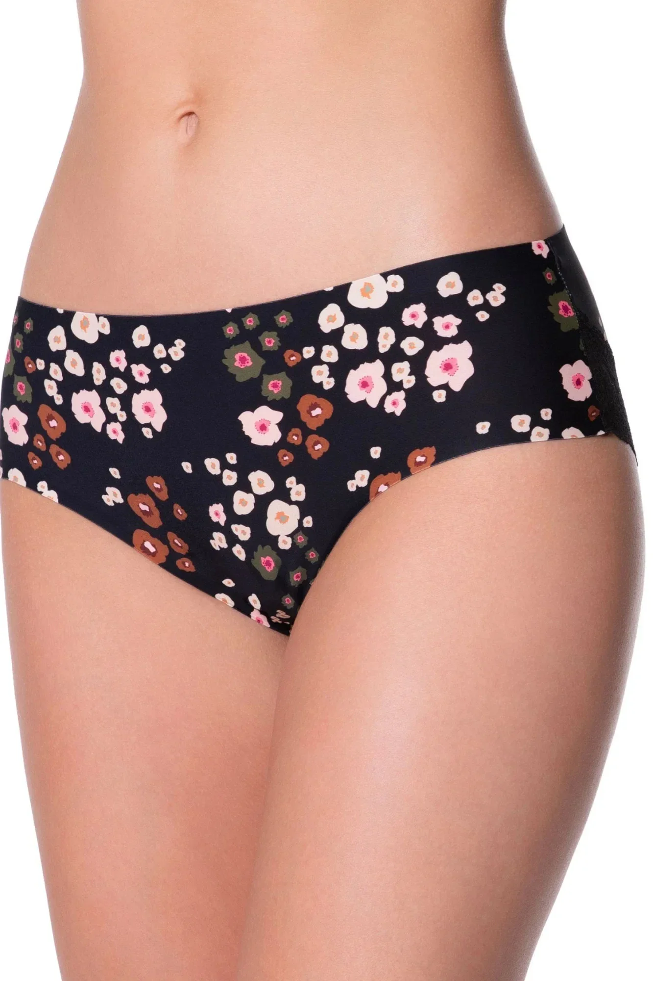 Dámské kalhotky Cheekie Peggy JULIMEX - hnědá barva - z vysoce jakostní tkaniny - se vzorem květin - zadní část zdobená krajkou - technologie INVISIBLE LINE na ultratenké okraje - řezané laserem - neviditelné pod oblečením