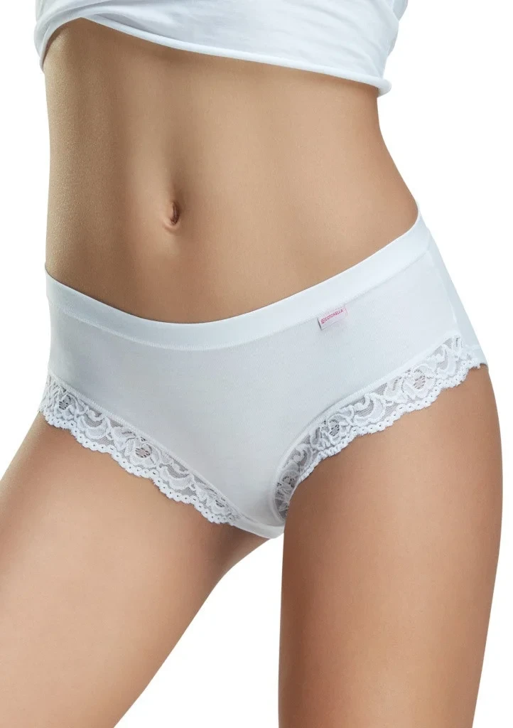 Dámské kalhotky klasického střihu značky Cotonella s vyšším pasem. Kalhotky jsou kombinací hladké látky a květinové krajky v přední části obvodu nohaviček. V horním obvodu je vsazena aplikace s logem Cotonella. Do vnitřního dílu je zapracován bavlněný klínek z BIO bavlny pro komfortní nošení.