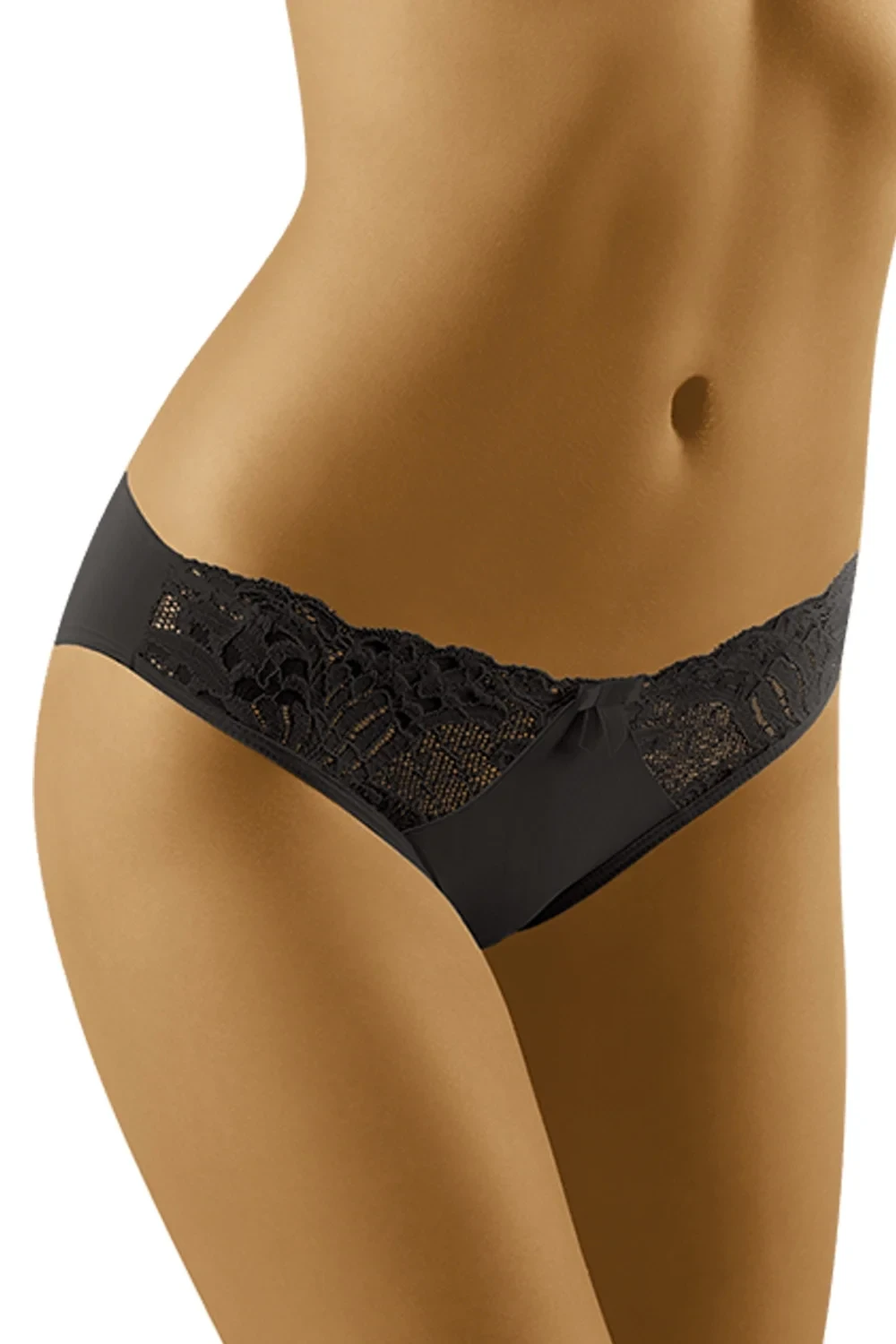 Dámské kalhotky Fifi black Wol-bar - černá barva - z pružného materiálu - zadní část je hladká - přední část zdobí krajka s mašličkou uprostřed