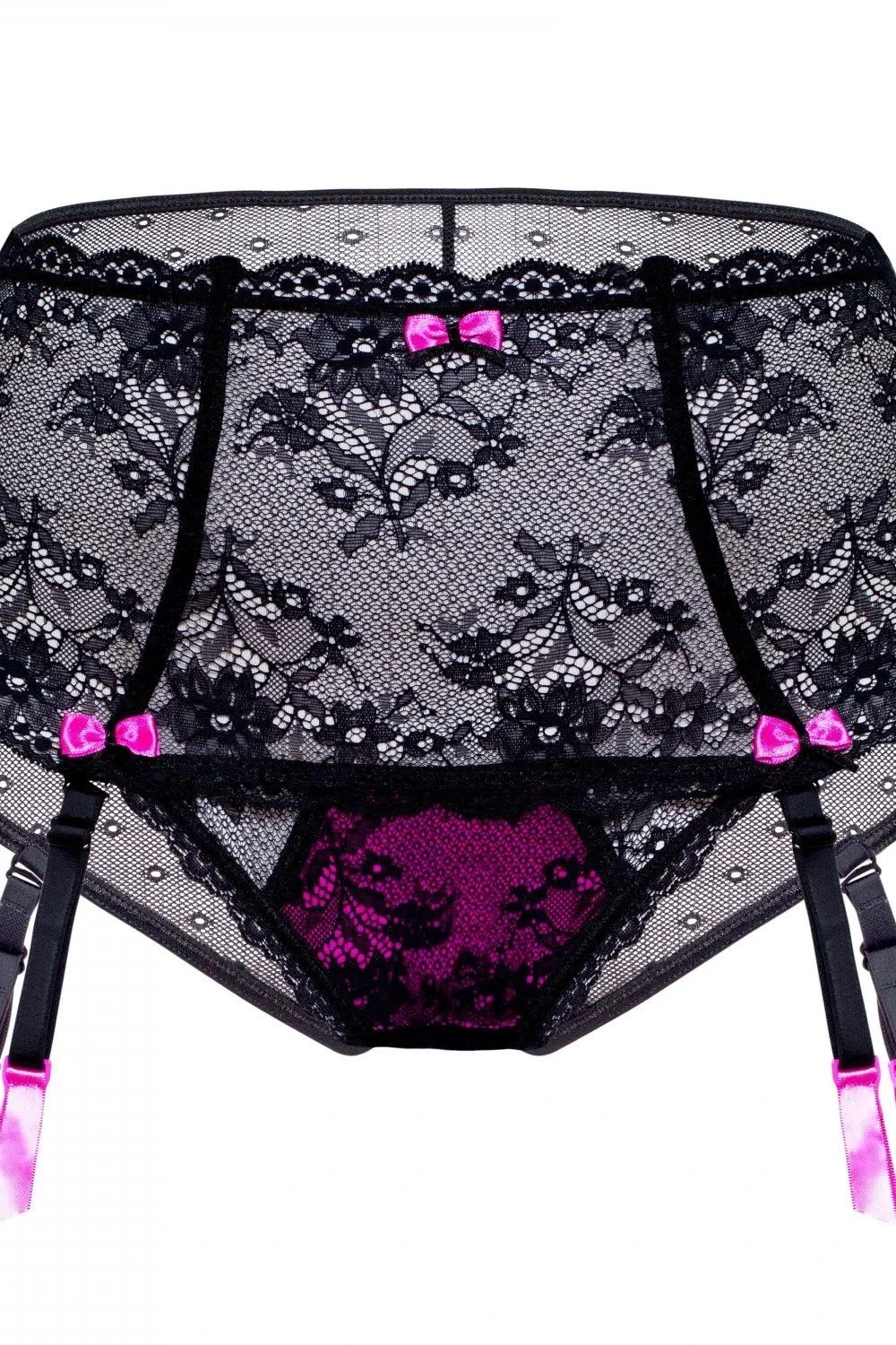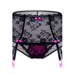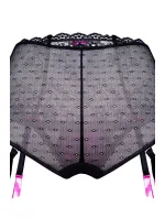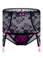 Dámské kalhotky Fifii belt ROZA - černá barva - vyrobené z krajky s květinovou výšivkou - vyšší pas - odpínatelné a nastavitelné podvazkové pásky - zadní část z mikrovlákna - ozdobné mašle ve fialové barvě