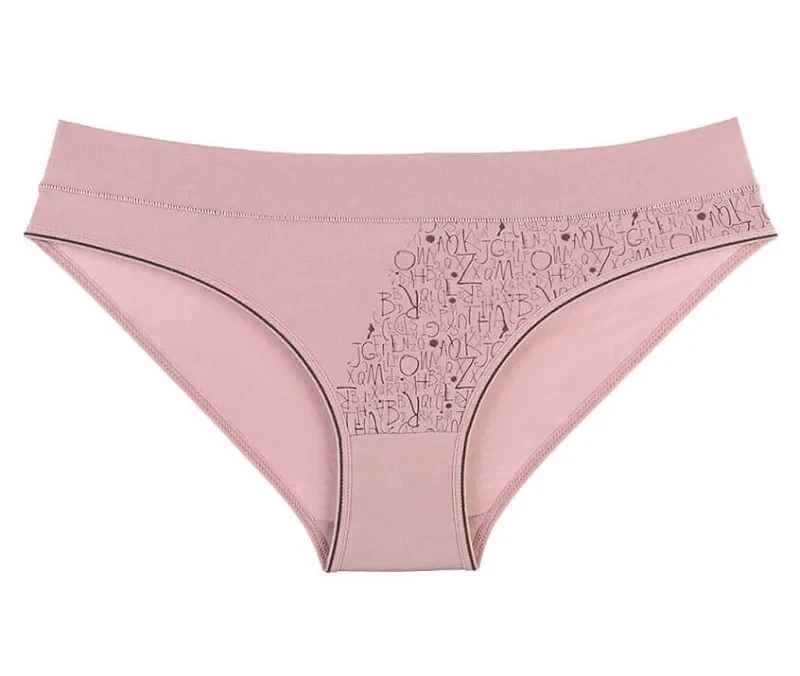 Dámské kalhoky Frída. Dámské kalhotky klasického střihu s elastickou gumou v pase mají částečně potištěnou přední část drobnými písmenky. Použitý materiál je jemný a poddajný na dotek.