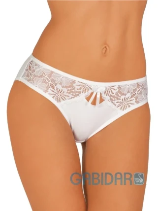 Dámské kalhotky bokového střihu od značky Gabidar. Kalhotky jsou vyrobeny z velice příjemné bavlny a díky tomu jsou kalhotky velice pohodlné. Přední část je kombinovaná jemnou krajkou s květinovým vzorem a je ozdobena otvůrkem s mašličkou. Zadní část je celá hladká.