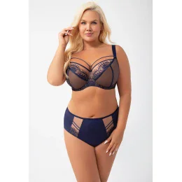 Kalhotky jsou vyrobené z jednobarevného tmavě modrého mikrovlákna. Přední díl modelu zdobí vsadky z transparentní síťoviny s efektní krajkou a páskami. Zadní díl kalhotek lemuje tyl.